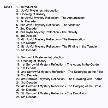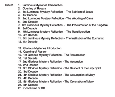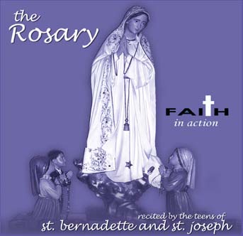 "The Rosary" CD is a commercial quality 2 CD compilation recited by the teens at St. Bernadette and St. Joseph Parishes as a fundraiser for upcoming youth retreats. The CD contains all of the mysteries of the Rosary and a reflection on each. The cost of the 2 CD set is a bargain at only $8 each.