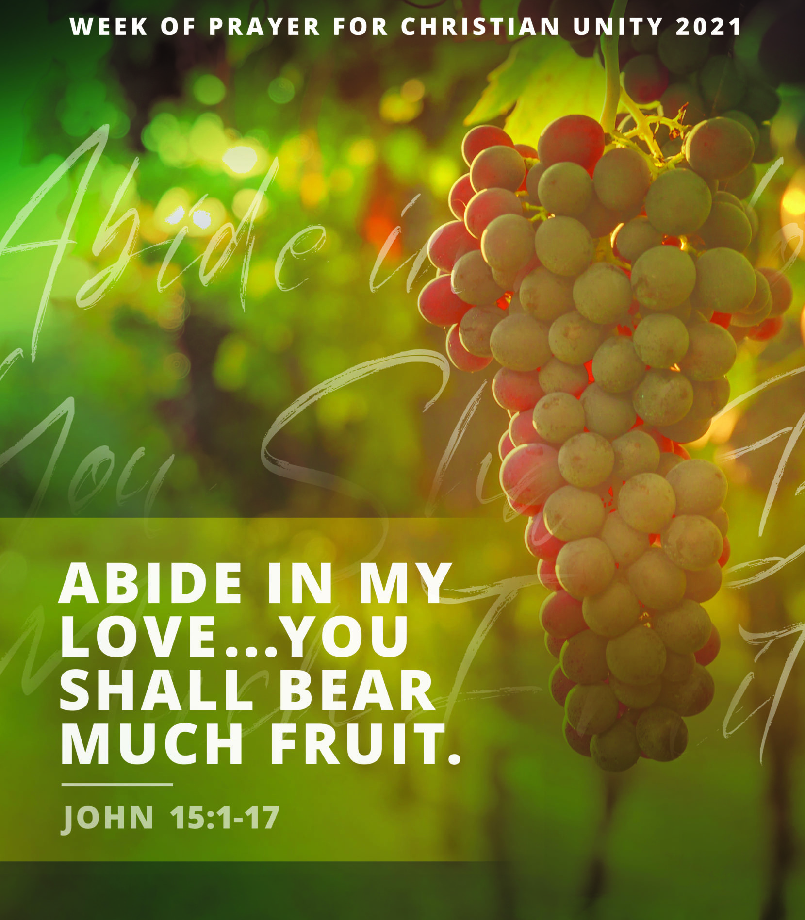 Prayer: Gracious Lord, we pray for all the member of your holy Church, that all may abide in you and you in them, that they may be one in your love and bear much fruit. We also pray for the world, that all may come to believe in your love for them by the fruit of our witness. We know that our divisions are a source of scandal to your world, and we know that in love we are called to unite as one in the vine and branches. The vine is our Lord Jesus Christ, your Son. We are meant to be his branches. Help us we pray, to love, to forgive, to seek justice and to be your prophetic voice in the world. May your grace effect growth of good fruit among us, that our world may realize peace. We ask all this in the name of Jesus, your Son and in the power of the Holy Spirit, One God, for ever and ever. Amen.