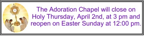 An updated Adoration Schedule is in the vestibule. We have many open hours available for you to spend time alone with Jesus. Call the office to let us know what time you are choosing.